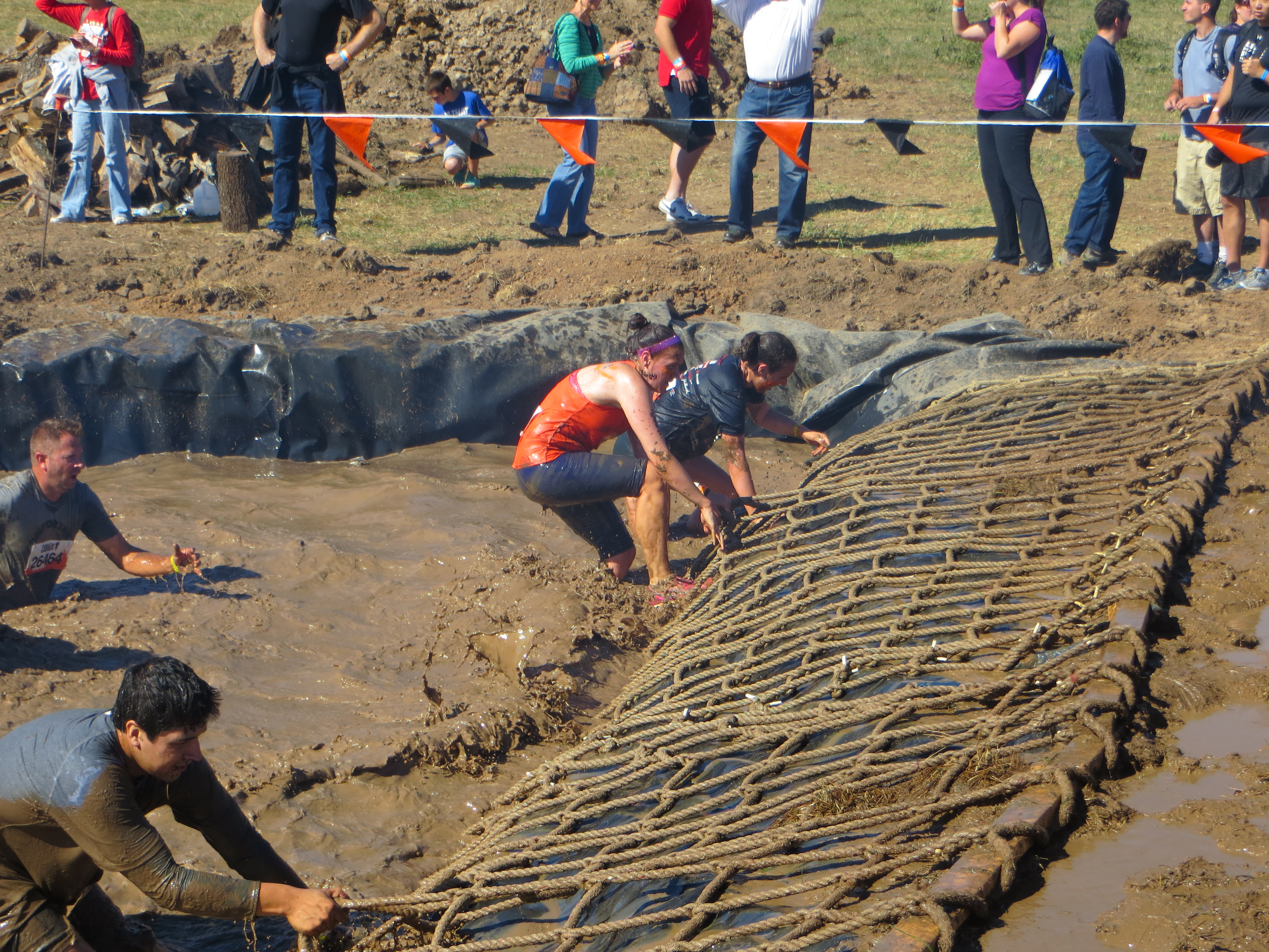 Our next obstacle was a mystery obstacle, which involved climbing over a mud hill and jumping over fire into a pit, and then pulling ourselves out with a cargo net.